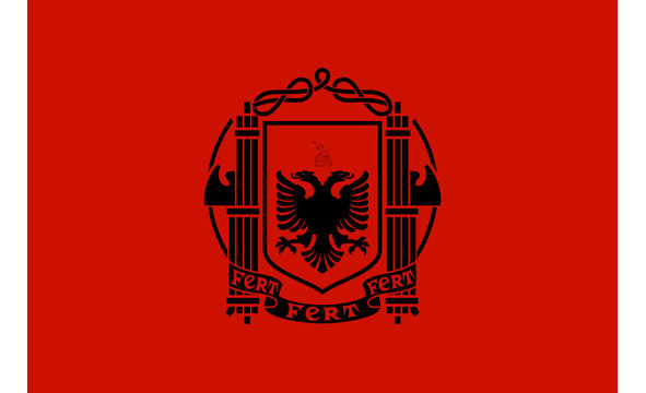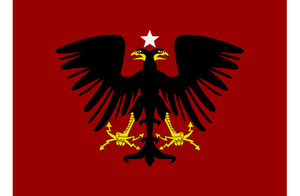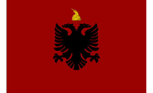 В 1939 г. Албанию оккупировали итальянские фашисты и 28 ноября 1939 г. итальянский генерал-штатгальтер утвердил новый «национальный» флаг: на красном полотнище черный двуглавый орел, увенчанный шлемом Скандербега на красном щите, два черных ликторских пучка, связанные савойскими узлами и лента с девизом: «Готов».