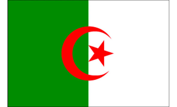 Официально государственный флаг Алжира был утвержден 3 июля 1962 г. Он представляет собой прямоугольное полотнище (пропорции 2: 3), состоящее из зеленой и белой вертикальных полос, на стыке которых изображен красный полумесяц, обращенный от древка, а между его рогами, на белой половине – красная пятилучевая звезда.