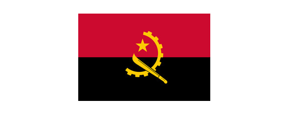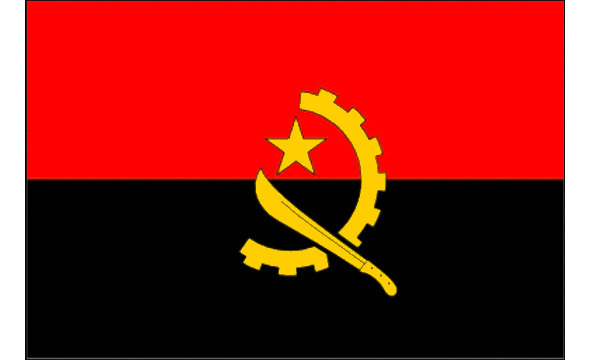 Собственный государственный флаг Анголы (пропорции 2: 3) впервые был поднят 11 ноября 1975 г. на центральной площади столицы Луанды вместо спущенного флага Португалии. Его полотнище состоит из двух горизонтальных полос: верхней красного цвета и нижней – черного. В центре флага изображена золотистая эмблема: перекрещенные половина зубчатого колеса и нож-мачете, над которым пятилучевая звезда.