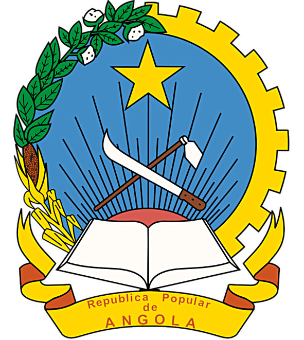 Герб независимой Анголы был учрежден 11 ноября 1975 г. В его голубом поле изображена раскрытая книга, как символ образования, знаний и культуры; над ней – красное восходящее солнце, символизирующее новое общество; на фоне солнечных лучей – перекрещенные мотыга и нож-мачете, символизирующие мирный труд и борьбу за свободу; над ними – золотая пятилучевая звезда независимости, которая была изображена на флаге МПЛА. Справа поле герба обрамляют золотой стебель кукурузы с початком, зеленые листья кофе и стебли хлопка с раскрытыми коробочками. Слева поле обрамляет половина золотого зубчатого колеса. Кукуруза, хлопок и кофе являются самыми важными сельскохозяйственными культурами страны, они символизируют крестьян; зубчатое колесо – рабочих. На ленте герба первоначально было начертано «Народная Республика Ангола».