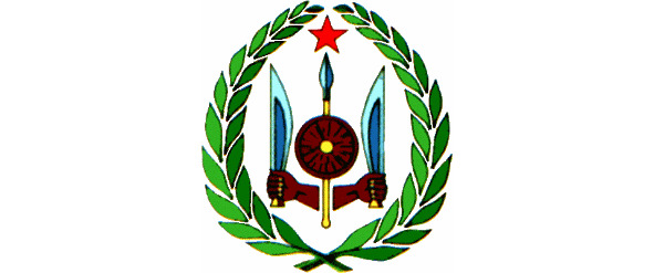 В серебряном поле герба – копье, по середине которого круглый золотой щит – традиционное оружие народов страны, они символизируют готовность защищать родину; по обе стороны от копья – руки сжимающие поднятые крестьянские ножи – символизирующие оба народа, которые составляют 95% населения страны (руки темно-коричневые, древко копья светло-коричневое, ножи и наконечник копья стального цвета). В вершине герба – красная пятиконечная звезда, символ независимости и единства. Все изображение окружено двумя перекрещивающимися внизу ветвями лавра, которые символизируют единство, мир и победу в национально-освободительной борьбе.