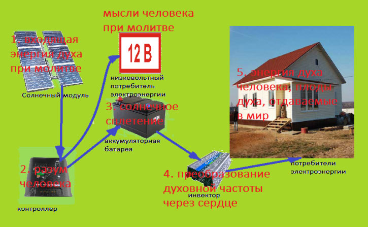 А важнейшая задача ”контроллера” – пропустить энергию духа, без каких либо помех, искажений, через собственный ментал человека. Поэтому разуму лучше молчать, когда говорит дух. Но если вам, всё же, очень нужно решить, скажем, задачку психологического, ментального плана, воплотить некоторые идейки бытового плана, то и здесь, как нельзя, кстати, может тоже помочь молитва. На схеме это – электрическая лампочка в 12 В., напрямую запитанная от контроллера. Хотя, основные потребители энергии на выходе имеют напряжение 220 В. Следовательно, чем меньше препятствий с плана мыслей, тем больше КПД приносят плоды собственного духа, способствуя разработке и внедрению идей духовного плана.