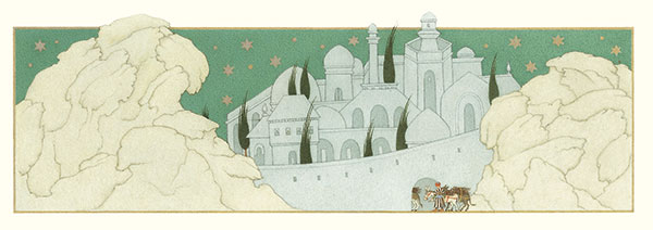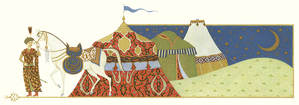 И вот выехал из ворот города караван верблюдов, груженных дорогой одеждой, золотом и драгоценными камнями. А впереди двигался большой отряд придворных, воинов и слуг. Путь их лежал в далекий Самарканд.