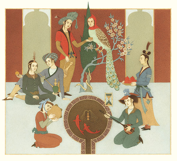 И вдруг сад наполнился веселыми голосами и громким смехом. Из дверей дворца вышла жена Шахрияра в окружении рабов и служанок. Она присела на край фонтана, а красивый молодой раб принялся обнимать ее, играть и смеяться. А рабы и невольницы танцевали вокруг них под музыку. И так они развлекались до тех пор, пока сумерки не поглотили сад, а затем скрылись в дворцовых покоях.
