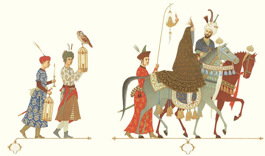 Сказав это, она приказала слугам искупать ее и умастить тело приятными благовониями. Ее причесали, украсили волосы драгоценными каменьями и фазаньими перьями, увили запястья и лодыжки золотыми цепочками, нарядили в шелка и опустили на лицо тончайшую вуаль. И только тогда оседлали лошадей, и Шахерезада следом за отцом отправилась во дворец.