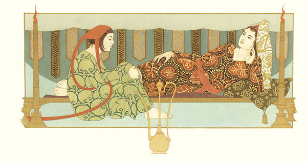 Шахерезада поцеловала руки и край туфель Шахрияра, возлежавшего на шелковых покрывалах, устроила его голову на своих коленях и начала рассказывать. Сказки изливались из ее уст, как свежайший источник, питающий устье великой реки. Одна сказка сменялась другой. И были они так увлекательны, что Шахрияр не замечал, как текли минуты и часы, отсчитывающие движение звезд и луны. Но едва кончилась ночь и в окно заструился свет утра, Шахерезада прекратила рассказ.