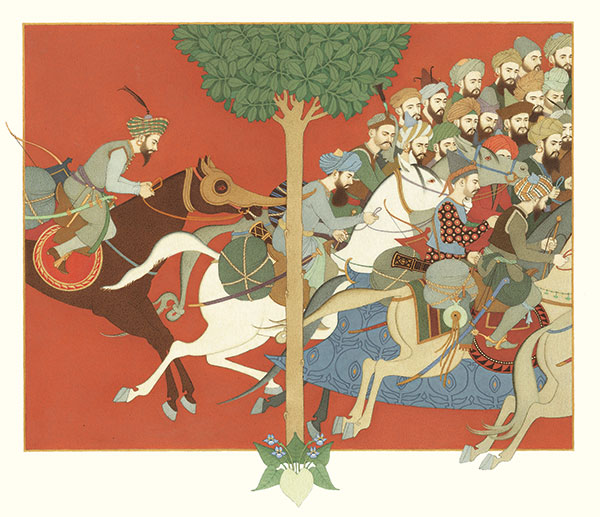 Получив послание своего брата, Шахзаман так возрадовался, что три дня пировал вместе с прибывшими гостями. Три дня еще он собирался в путь. И вот в назначенный час, обряженный в лучшие одежды, выехал Шахзаман в сопровождении всадников и слуг. Но едва солнце опустилось за дальние барханы, вспомнил он, что забыл дома особый подарок, припасенный им для брата. Быстро развернул он коня и поскакал назад к Самарканду.