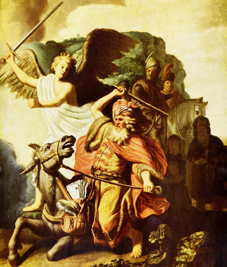 После краткой беседы пророка с бедным животным глаза Валаама открылись, и он увидел ангела, стоявшего перед ним с обнаженным мечом. Ангел упрекнул пророка за то, что тот бил свою ослицу, и пророк – понимая, как сильно Всевышний противится его намерению проклясть израильтян, – пытается успокоить его: «Если это неугодно в глазах твоих, то я возвращусь». Ангел разрешает ему продолжить путь, но с условием: «Лишь то, что я говорить буду тебе, ты говори».