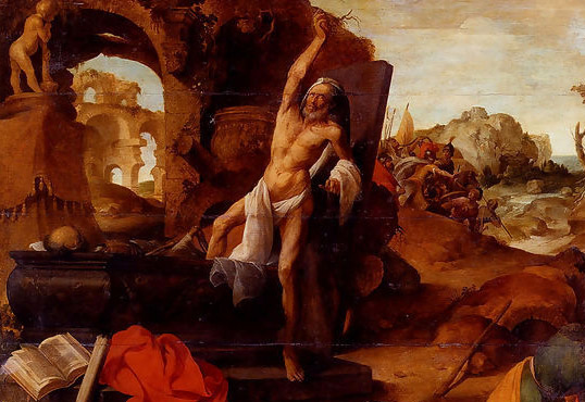 Как известно, камень угодил Голиафу прямо в лоб, и тот упал без чувств на землю. Давид же, подбежав, вытащил у него меч и его же собственным оружием отсек ему голову. Увидев это, филистимляне, объятые ужасом, бросились в бегство, а израильтяне гнали их до самых городов их и многих убили.