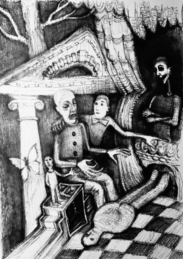 Они напоминают молодых студентов, которые спасаются от не совсем трезвого преподавателя. Это изощренный старичок – интеллигент, который преподает цензуру в закрытых аудиториях. Приходит мгновенная телеграмма. Старичок вращает глазами, пытаясь догадаться, кто же это прислал ему телеграмму. Он соблюдает общественные законы и правила дорожного движения. Скажи, сколько времени. У меня нет часов. Время замкнулось.