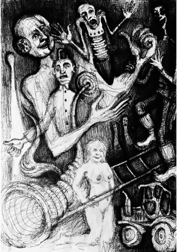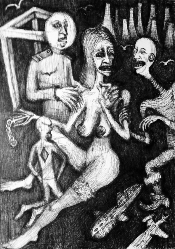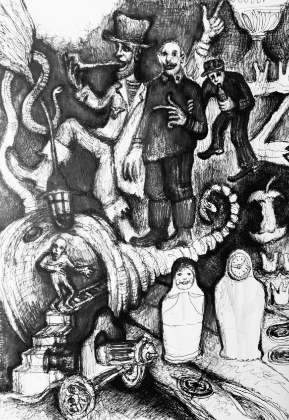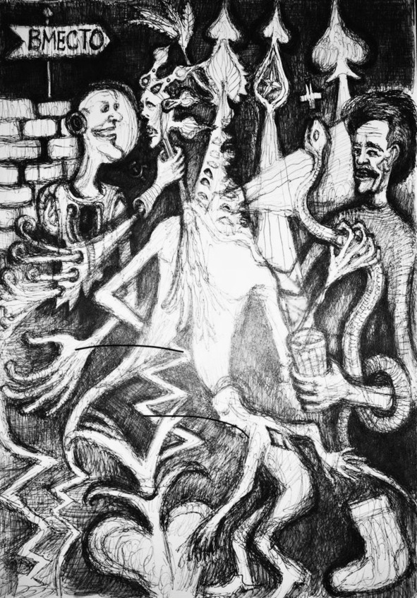 Я вижу чьи-то школьные ботинки, завернутые в газету. Они просто стоят на тротуаре. Я вижу грандиозное недостроенное здание, думаю, что я уже на следующей улице. Мужчина в кепке боязливо терзает свою жену, он делает это на виду у всех. Летают какие-то существа, летучие твари, похожие на лягушек с крыльями. Крутятся колеса, лопасти и шестеренки. В туманном магазине продают замороженное мясо. Я все еще гуляю, говорю глупые шутки. Воздух здесь имеет соленый привкус. Друзья здороваются друг с другом. Врачи пугают своих больных диагнозом. Трубы покрылись ржавчиной. В луже пульсирует неясная сумасшедшая жизнь. Люди идут с полными карманами, за пазухой у них тоже что-то спрятано, все отражается на лице, они уже нисколько не маскируются. Все спуталось, морочат друг друга, безумно хохочут в герметичной камере, трогают влажные стертые кирпичи пола, соблюдают традиции, хотя это нелегко. Достаточно взрослый человек в ушанке листает мою книгу, потому что она сводит его с ума, то есть фактически она необходима сейчас для его головы.