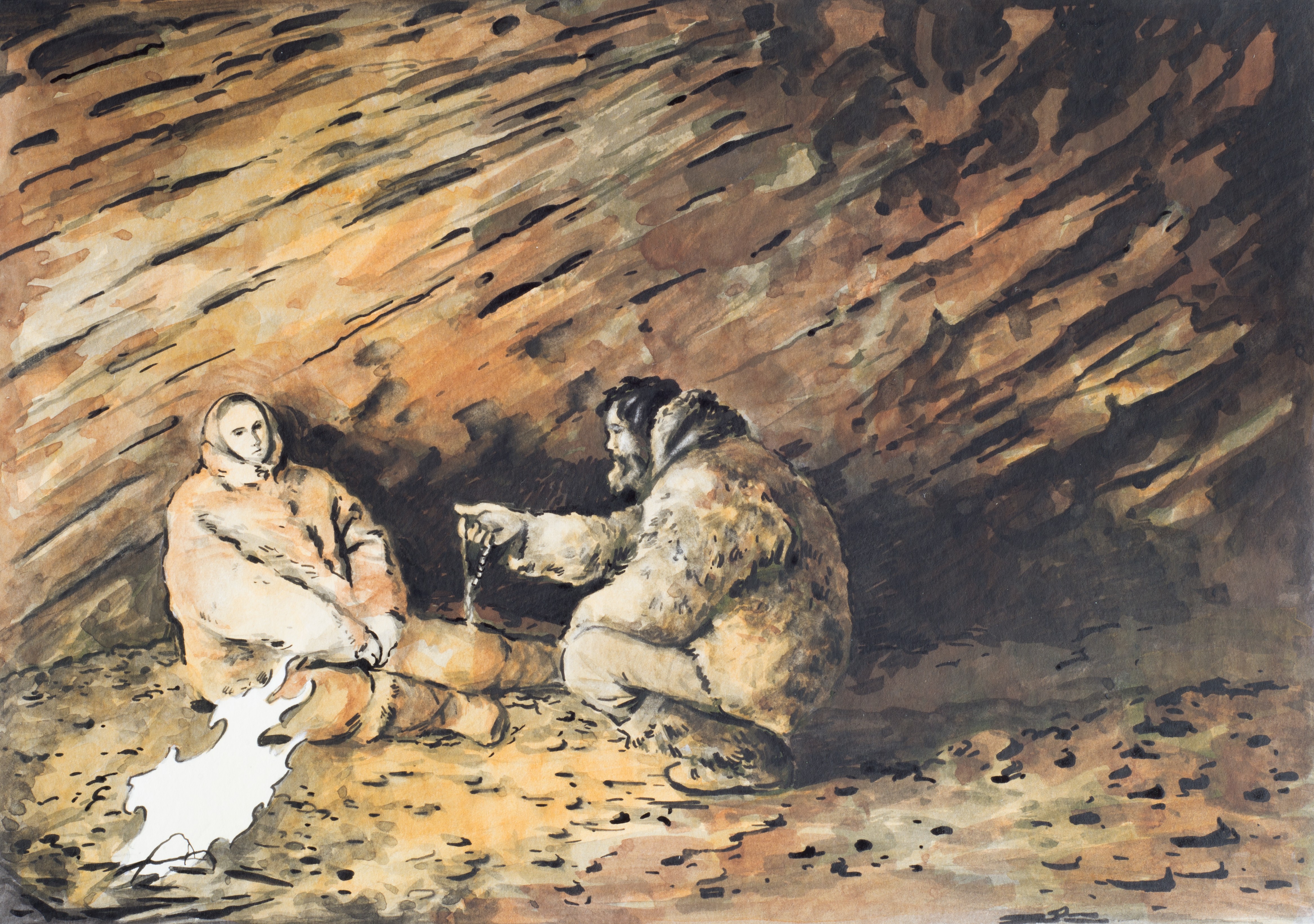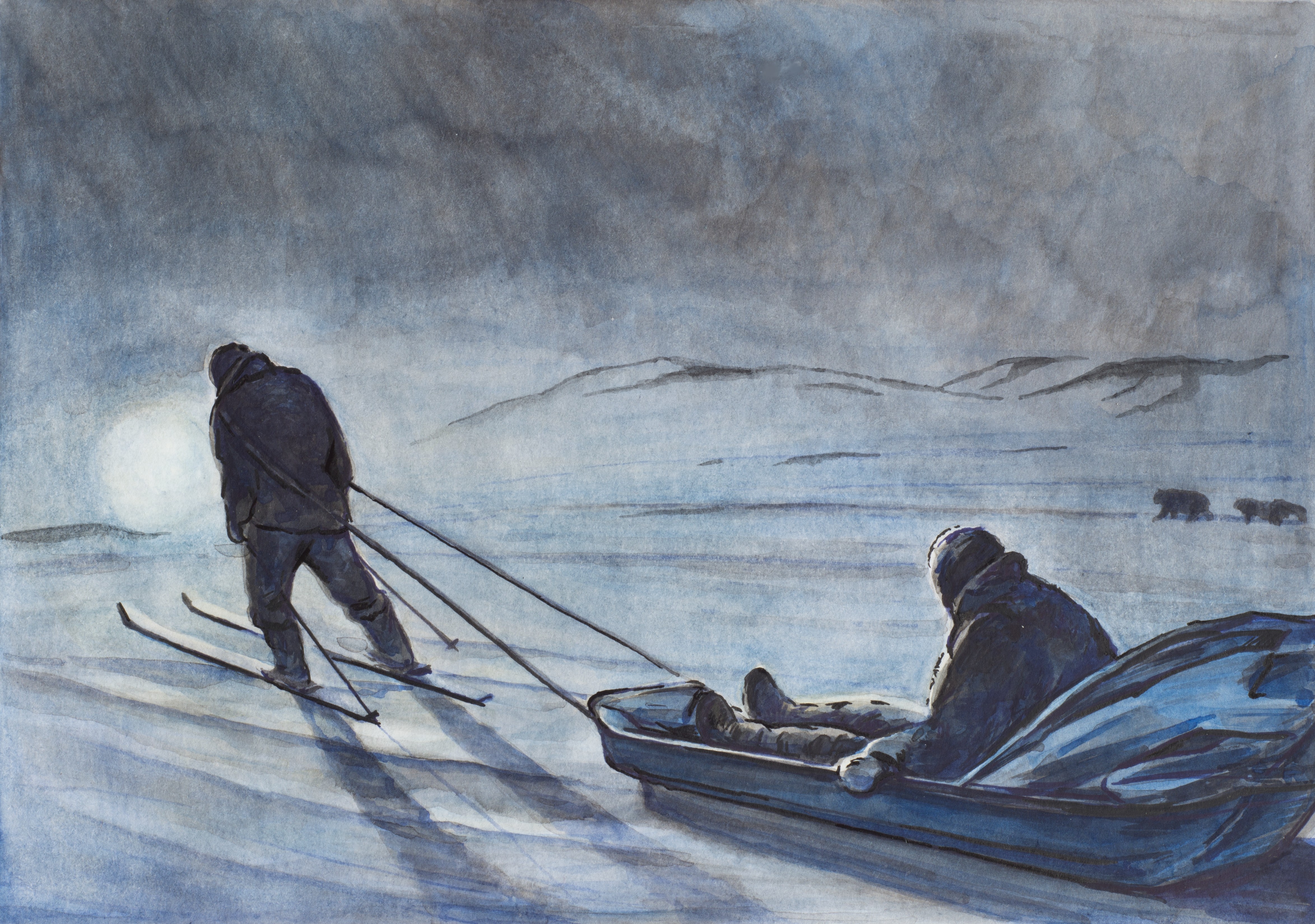 За спиной в темном небе ярко мерцало полярное сияние, но это была колкая красота для замерзших и обессилевших от голода людей. Такая же колкая, как мороз и снежная пыль, волнами пролетающая низко над землей, обдавая их ледяным мертвенным дыханием.