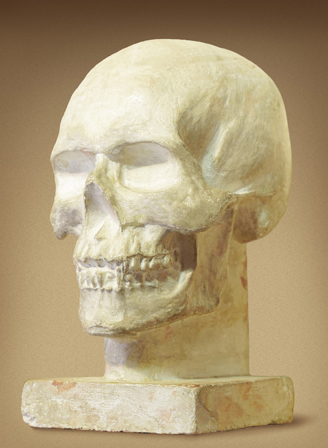 Что в итоге? Мы уточнили все необходимые элементы, большие формы, обозначенные на предыдущем этапе. Теперь стоит отдохнуть и покрыть работу легким тоном, показав разницу между передней и боковой поверхностями черепа. Благодаря этому можно снова убедиться в правильности объемов и форм.
