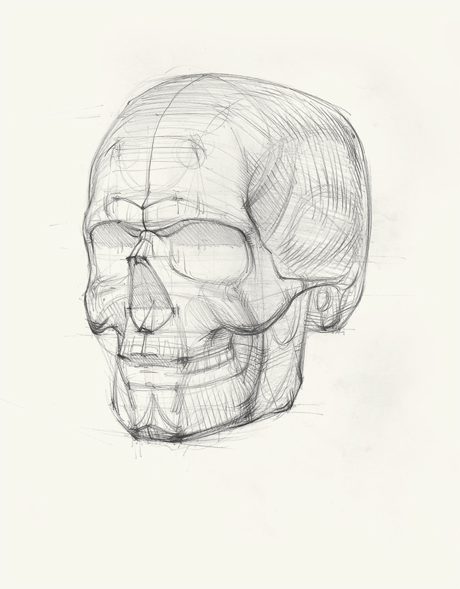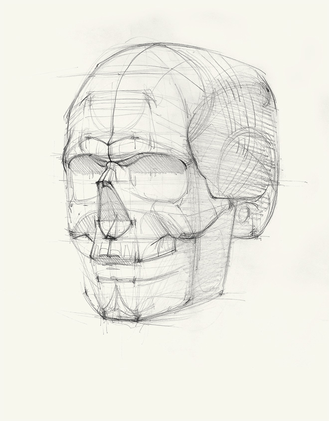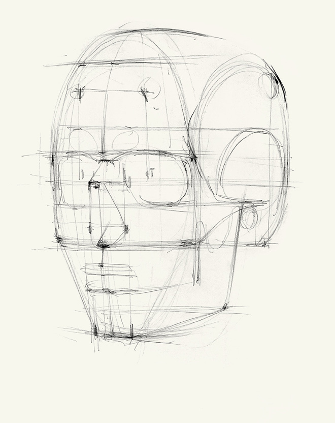 4. ОТРИСОВКА МЕЛКИХ ДЕТАЛЕЙ. ПРОРАБОТКА ОСНОВНЫХ ТОНАЛЬНЫХ ОТНОШЕНИЙМы уже нашли и уточнили крайние точки и контуры форм черепа, а на четвертом этапе начинается настоящее рисование. Мы будем прорабатывать каждый элемент, невзирая на большие объемы. Однако фокусироваться на отдельных деталях мы будем с учетом симметрии, обязательно сохраняя связь правой и левой частей.