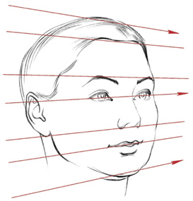 Обозначив лобные бугры еще раз, мы можем зафиксировать линию боковой надбровной части. Как и челюстное пространство, лоб условно разделен на три части: передняя поверхность и отходящие от нее две боковые слева и справа. Направление с двумя изменениями поворота фиксируем горизонтальными линиями, показывающими поворот поверхности.