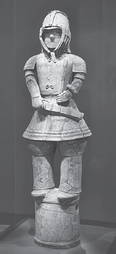 Ханива из терракоты изображает воина в облегающей куртке с расклешенной юбкой, в шлеме и с мечом. VI век н. э.