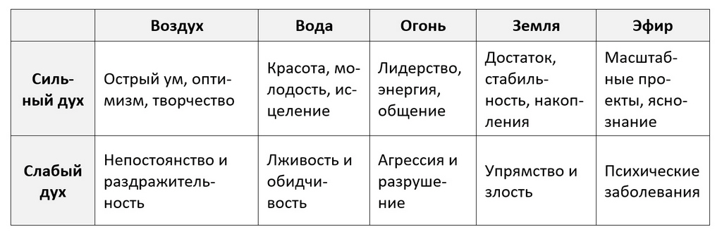 Выделяют 4 основные стихии: Воду, Воздух, Огонь, Землю и пятую стихию Эфира, которую можно назвать кодовом словом «Космос». Первые 4 стихии равномерно распределены по людям, а пятая встречается крайне редко – примерно 2-5% от всех людей. Каждая стихия наделяет своего носителя сильными и слабыми сторонами.