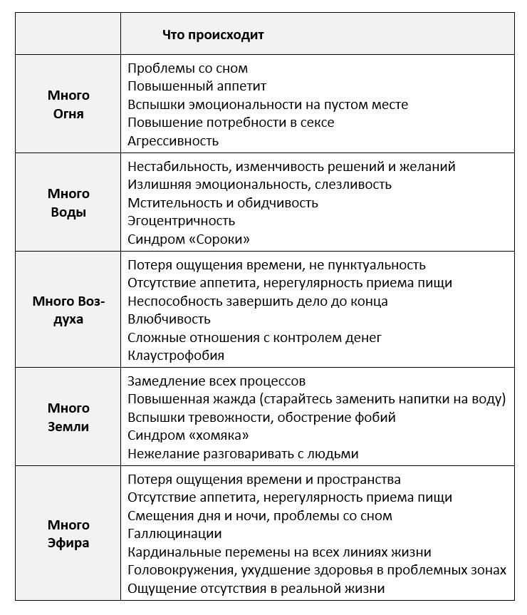 Если уровень неродной стихии вырос настолько что, стал неподконтрольным и дискомфортным, то силу такой стихии нужно снижать принудительно. Для этого можно использовать способы поднятия уровня родной стихии: музыку, акцент внимания на других цветах, используй родные ароматы. Полные сводные таблицы ты найдешь в главе 8.