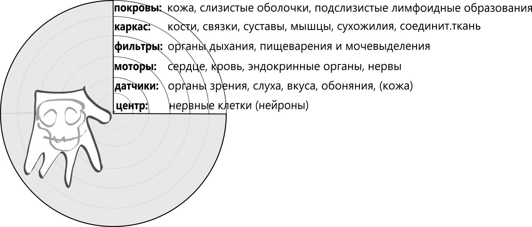 На следующем уровне опорно-двигательный аппарат – кости, суставы и связки, соединительная ткань и мышцы. Каркас. Задача у него простая, роль выполняет исключительно исполнительную, степень ответственности невысокая. Кости, хоть и являются фактором защиты, но сами по себе подвержены внешнему воздействию. Мышцы, связки прикрыты только кожей. Утрата части каркаса не повлечёт за собой фатальные последствия для всего Тела.