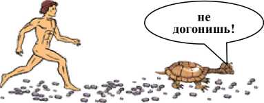 «Ахиллес и черепаха»В апории самый быстрый грек (Ахиллес) не догонит самое медленное животное (черепаху)! Ведь когда Ахиллес прибежит в ту точку, которую занимала черепаха в момент старта, то черепаха отползет от своего исходного положения на такую часть первоначального расстояния между собой и Ахиллесом, на сколько ее скорость меньше его скорости. И эта ситуация будет повторяться бесконечно.