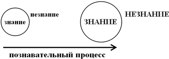 Сократовский парадокс указывает на такую особенность познавательного процесса: чем больше мы узнаем, тем больше соприкасаемся со сферой незнаемого, т. е., грубо говоря, чем больше мы знаем, тем больше знаем, что не знаем. Физик Р. Милликен говорил: «Полнота познания всегда означает некоторое понимание глубины нашего неведения». Такое противоречие можно наглядно представить следующим образом:
