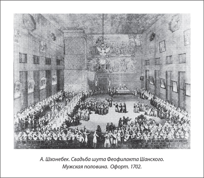 Точное описание этой шутовской свадьбы оставил камер-юнкер Фридрих Вильгельм Берхгольц: “Новобрачный и его молодая, лет 60, сидели за столом под прекрасными балдахинами, он с царем и господами кардиналами, она с дамами. Над головою князя-папы висел серебряный Бахус, сидящий верхом на бочке с водкой… После обеда сначала танцевали; потом царь и царица, в сопровождении множества масок, отвели молодых к брачному ложу. Жених в особенности был невообразимо пьян. Брачная комната находилась в… широкой и большой деревянной пирамиде, стоящей пред домом Сената. Внутри ее нарочно осветили свечами, а ложе молодых обложили хмелем и обставили кругом бочками, наполненными вином, пивом и водкой. В постели новобрачные, в присутствии царя, должны были еще раз пить водку из сосудов, имевших форму partium genetalium [половых органов – Л.Б.]… и притом довольно больших. Затем их оставили одних; но в пирамиде были дыры, в которые можно было видеть, что делали молодые в своем опьянении”.