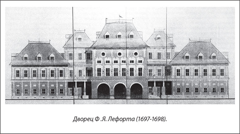 По инициативе Петра в 1698 году на берегу Яузы для Лефорта был построен роскошный дворец под руководством мастера каменных дел Дмитрия Аксамитова. Он являл собой великолепное сооружение с крышами, украшенными резными гребнями. Зал дворца высотой 10 метров и площадью 300 квадратных метров, обитый шпалерами и английским красным сукном, был украшен портретом Петра, картинами и множеством зеркал.