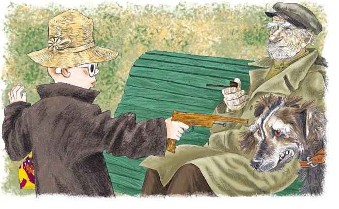 И дед повалился на скамейку. Странный человек от изумления открыл рот. Вы, конечно, догадались, что пистолет у него был деревянный и никак не мог выстрелить по-настоящему.