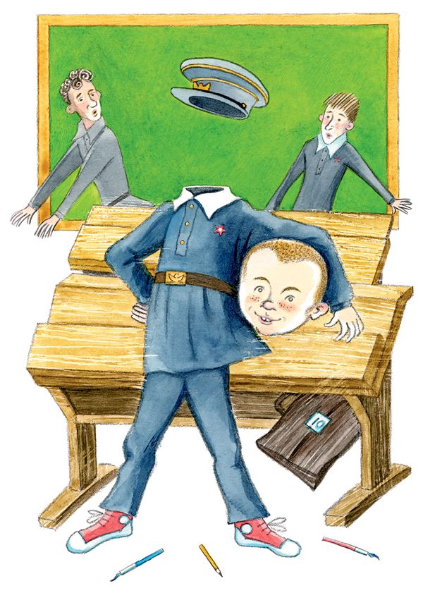 Смотрит он на кляксы и мечтает. Хорошо бы сделать так, чтобы голова отвинчивалась. Пришел бы в класс, спокойненько сел бы на свое место, отвинтил бы свою собственную голову и спрятал бы ее в парту. Идет урок. Ивана, конечно, не спрашивают: не может же человек без головы говорить! Ведь говорит-то он ртом, рот-то у него в голове, а голова – где?