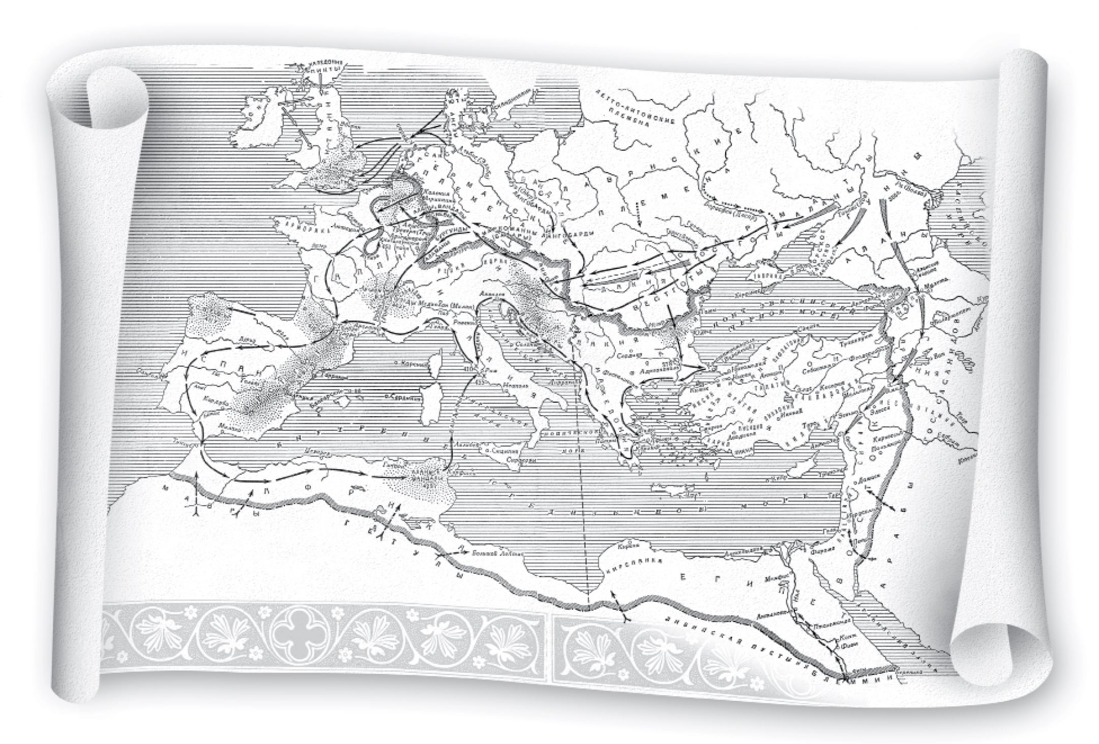 Все было, как уже говорилось, достаточно стабильно до II в. н. э., когда в результате пассионарного толчка началось Великое переселение народов. А началось оно так. От берегов южной Швеции, которая называлась тогда Готия, отошли три готские эскадры с храбрыми воинами – остготами, визиготами и гепидами. Они высадились в устье Вислы, поднялись к ее верховьям, дошли до Припяти, миновали приднепровские степи и вышли к Черному морю. Там готы – народ, привычный к мореплаванию, – построили корабли и начали совершать набеги на бывшую Элладу – Грецию. Захватывая города, готы грабили их, а жителей брали в плен. Греция принадлежала в то время Римской империи, и император Деций – страшный гонитель христиан, очень хороший полководец и смелый человек – выступил против готов, которые уже пересекли Дунай и вторглись на территорию Византии. Великолепная римская пехота, хорошо обученная, вооруженная короткими мечами, более удобными в бою, чем длинные, столкнулась с одетыми в шкуры готами, которые были вооружены длинными копьями. Казалось бы, у готов не было шансов на победу, но, к удивлению современников, римская армия была полностью разбита, потому что готы, умело маневрируя, завели ее в болото, где римляне увязли по щиколотки. Легионы лишились маневренности; готы кололи римлян копьями, не давая тем возможности вступить в бой. Погиб и сам император Деций. Это случилось в 251 г.