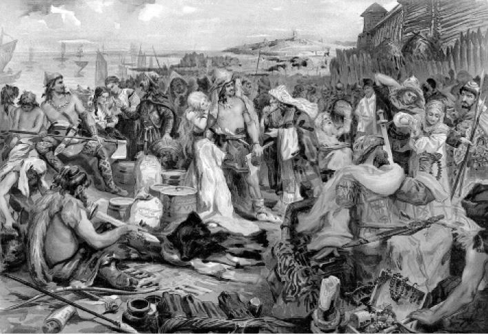 Для славян было бедствием соседство с древними русами, которые сделали своим промыслом набеги на соседей. В свое время русы, побежденные готами, бежали частично на восток, частично на юг – в низовья Дуная, откуда они пришли в Австрию, где попали в зависимость от герулов Одоакра (дальнейшая судьба этой ветви нам неинтересна). Часть русов, ушедшая на восток, заняла три города, которые стали опорными базами для их дальнейших походов. Это были Куяба (Киев), Арзания (Белоозеро?) и Старая Руса. Русы грабили своих соседей, убивали их мужчин, а захваченных в плен детей и женщин продавали купцам-работорговцам.