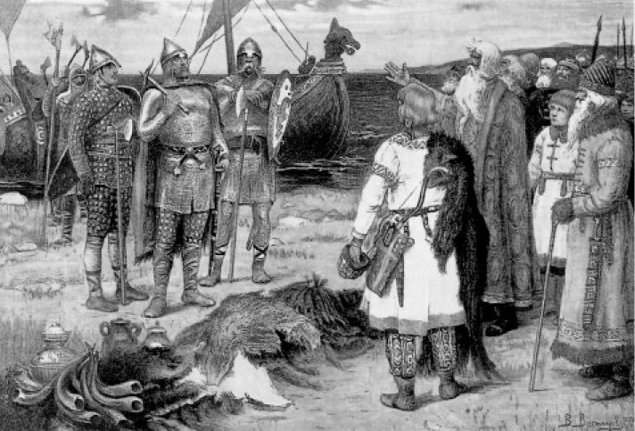 Биография Рюрика непроста. По «профессии» он был варяг, то есть наемный воин. По своему происхождению – рус. Кажется, у него были связи с южной Прибалтикой. Он якобы ездил в Данию, где встречался с франкским королем Карлом Лысым. После, в 862 г., он вернулся в Новгород, где захватил власть при помощи некоего старейшины Гостомысла. (Мы не знаем точно, означает ли слово «Гостомысл» собственное имя человека или нарицательное обозначение того, кто «мыслит», то есть сочувствует, «гостям» – пришельцам.) Вскоре в Новгороде вспыхнуло восстание против Рюрика, которое возглавил Вадим Храбрый. Но Рюрик убил Вадима и вновь подчинил себе Новгород и прилегающие области: Ладогу, Белоозеро и Изборск.