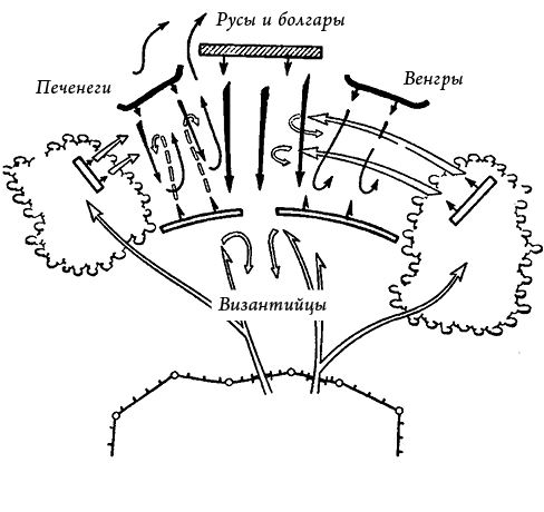 К несчастью Калокира, замысел которого открылся еще при Фоке, Цимисхий оказался способным и деятельным полководцем. Новый василевс бросил на Святослава и Калокира созданные его предшественником отличные войска. Кроме того, еще Фока успел распорядиться, чтобы союзники Византии – левобережные печенеги – напали на Киев. Поэтому Святославу пришлось оставить Болгарию и устремиться на Русь спасать собственную столицу, свою старую мать и детей. Но когда он подоспел к Киеву, война уже завершилась, не начавшись. Пришедшие с севера войска воеводы Претича остановили печенегов. Их хан обменялся с Претичем оружием и, заключив мир, ушел в приднепровские степи.