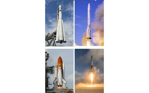 Рисунок 22. Ракетоноситель «Спутник» на базе ракеты Р-7 (1957 г); Ракетоноситель «Протон» (1961—1966 гг.); Космические ракетоносители многоразовых кораблей программы «Спейс Шаттл»; Ракетоноситель многоразового использования компания SpaceX (2016 год)