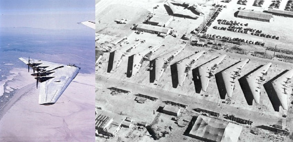 Рисунок 31. Слева самолет Northrop XB-35 в воздухе, справа – построенные самолёты Northrop XB-35 на авиабазе Эдвардс