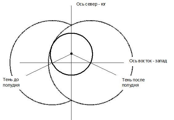 Греки также использовали подобный столбик в качестве указателя для солнечных часов и называли его Гномон и это название более привычно для нас. Гномон или Шанку ставят в центре участка, в области пупка Пуруши, берут веревку, длина которой равна двум длинам Шанку и чертят на земле окружность с центром там, где установлен Шанку и диаметром в две его длины. Затем, на восходе и на закате Солнца наблюдают, когда тень от Шанку коснется этих окружностей, и отмечают эти точки. Впрочем, эти отметки можно сделать и в любые два момента времени, одинаково до и после полудня. Соединяя полученные две точки, получим ось восток – запад. Затем, из найденных точек, как из центров, чертят окружности с радиусом тоже равным двум длинам Шанку и, соединяя точки их пересечения, получаем ось север – юг.