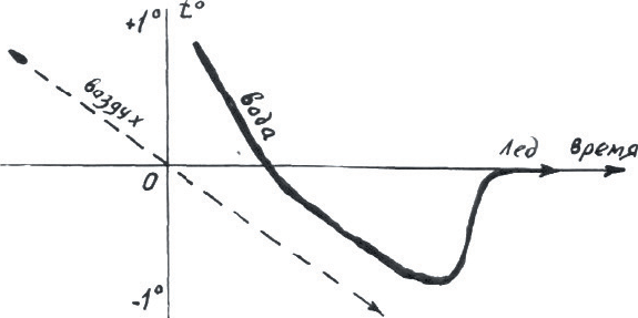 Что касается изгиба на графике температуры начала замерзания, то он вызывается некоторым переохлаждением воды из-за недостатка ядер кристаллизации – условия, необходимого для начала замерзания. Как только ядро кристаллизации попадает в такую воду, её переохлаждение мгновенно реализуется на образование соответствующего дополнительного количества льда уже вне связи с продолжающейся потерей тепла водой в атмосферу. Такой процесс скоро и неизбежно вызывает повышение температуры вновь образующегося льда до температуры нормального замерзания воды, что и отражает график. Количество образующегося таким путём льда легко определяется, если известна температура, до которой переохлаждалась вода.