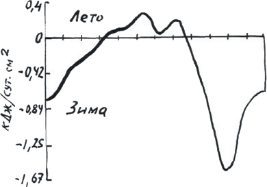 Рис. 5. Суммарная кривая внешних тепловых потоков, воздействующих на «ледовитое» море (по В. В. Шулейкину, 1962).