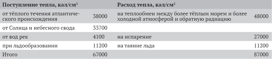 Ныне стало очевидным, что этот расчет чрезвычайно далек от достоверного. Это относится почти ко всем статьям баланса, но достаточно показать всего две важнейшие расходные: потери тепла при теплообмене открытой воды с атмосферой и на испарение. Например, оказалось, как пишет В. В. Степанов (1983, с.70), что «Во всех океанах, кроме Северного Ледовитого, в процессе турбулентного обмена тепло отдается атмосфере, тогда как в арктической области это единственная приходная составляющая бюджета тепла». Этот приход значителен и без остатка перекрывает радиационный расход тепла с акватории Арктического бассейна, ибо воздух летом здесь бывает нагрет больше, чем вода. В работе зарубежных авторов «Климат полярных районов» (1973) узнаем, что при летнем испарении, в силу тех же температурных различий, теряется не более чем 2500 кал/см2. Если согласиться с более правдоподобными данными о приходе тепла, показанными в левой колонке баланса В. В. Шулейкина, то сопоставив их с сильно уменьшившимися статьями расхода, ничего не остается, как признать, что годового баланса теплообмена Арктического бассейна с атмосферой просто не существует. Этот факт, кажущийся невероятным, вполне очевиден и долго прятался от науки всего-навсего за слепой приверженностью исследователей к стремлению замкнуть тепловой баланс во что бы то ни стало и ради того, чтобы якобы не нарушить закон сохранения энергии. Но как раз этот непорочный закон и нарушался в первую очередь. Он не нарушается только тогда, когда в теплобалансовом расчете никуда бесследно не теряется и не появляется неизвестно откуда любая доля энергии.