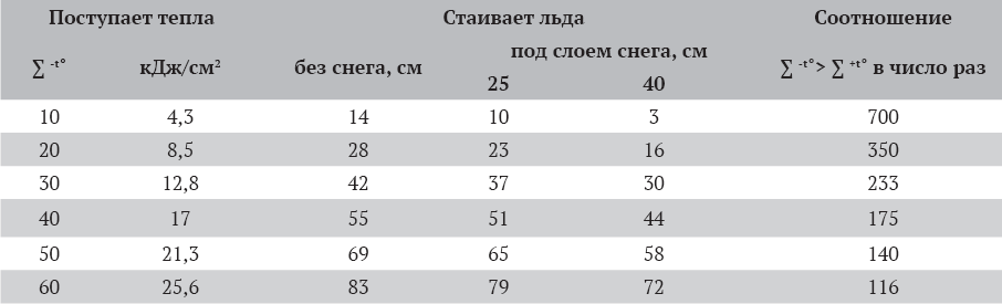 Сумма градусо-суток отрицательной температуры довольно уверенно определяется по многим данным станции «Северный полюс» (СП) и в среднем составляет ∑-t° = минус 7 000°. Сумма положительных температур по прямым измерениям температуры около 0 °C сколько-нибудь надежно не определяется. Но она может быть определена, как величина, эквивалентная количеству тепла, усваиваемого льдом при стаивании. Измеренное стаивание льда, а значит, и сумма градусо-суток положительной температуры имеет значительный разброс, что и принуждает нас выведенные соотношения сумм градусо-суток, а заодно и условия, их определяющие, сгруппировать (табл. 1).