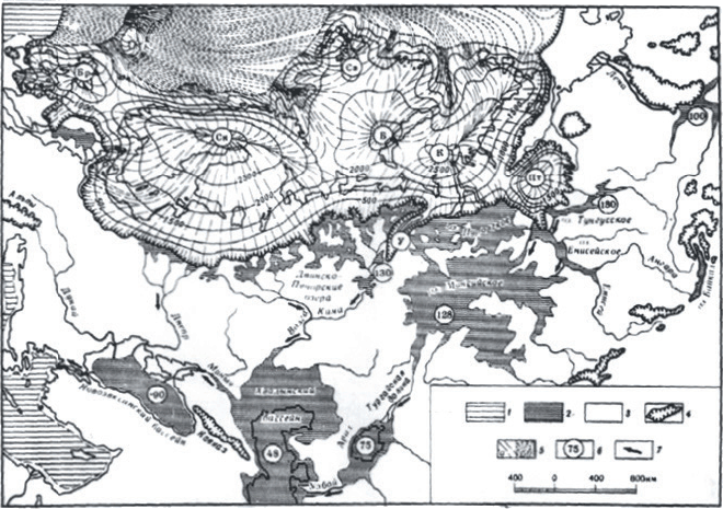 Рис. 7. Последний Евразийский ледниковый покров.1 – свободный от ледников океан; 2 – пресноводные бассейны; 3 – свободная ото льда суша; 4 – границы ледников; 5 – линия движения налегающих на ложе (а) и плавучих (б) ледников; 6 – уровни внутриконтинентальных бассейнов (относительно современного уровня океана); 7 – сток приледниковых вод. Буквенные символы – условные наименования ледниковых щитов (по М. Г. Гроссвальду, 1983).