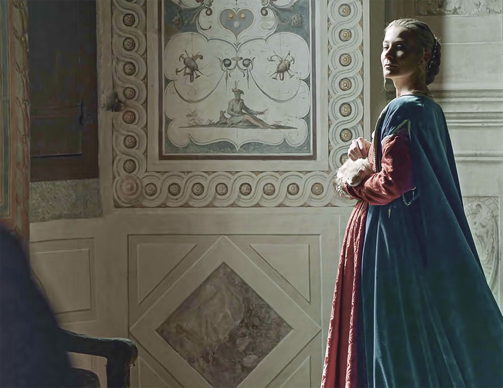 Ведь не только же для того, чтобы трудоустроить свою жену, Кончаловский снимает Юлию Высоцкую в крошечной роли «дамы с горностаем». В сцене у кардинала Джулио Медичи ее торжественная бессловесность, ее живописная неподвижность, а затем и плавное, чуть замедленное движение прочь из кадра свидетельствуют, кого на самом деле эта героиня полномочно представляет и чье незримое авторское присутствие величественно обозначает.