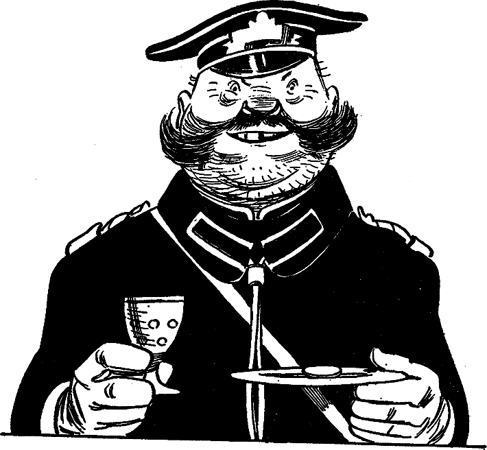 Ему выносят на блюдце рюмку водки и серебряный рубль. Городовой берет целковый, благодарствует и пьет за наше здоровье. Мы смотрим ему в рот. Крякнув, городовой замирает, предаваясь внутреннему созерцанию, словно прислушиваясь, как вливается водка в его полицейский желудок. Затем он опять щелкает каблуками и прикладывает руку к козырьку.