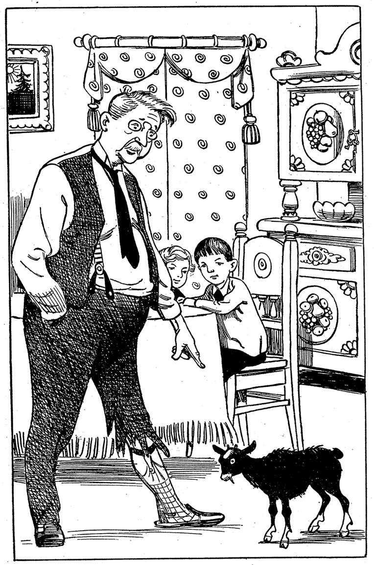 Козленок в ответ на это сказал «бе-е-е» и тотчас посыпал «кедровых орешков» на ковер. Потом он объел обои в кабинете и намочил на кресле. Папа, к счастью, спал в то время после обеда и ничего этого не видел. Мы немного повозились с веселым козленком. Вскоре он надоел нам, и мы забыли о своем курчавом товарище. Козленок куда-то исчез. Через час в пустой гостиной неожиданно раскатисто загремели аккорды пианино. Это нашедшийся козленок прыгнул с разбегу на клавиши. Папа от этого проснулся и заторопился в больницу на вечерний обход. Не зажигая света, он натянул в темноте брюки и, зевая, вышел в столовую. Мы с испугу разом сели оба на один стул. Мама всплеснула руками. Папа взглянул вниз и обмер… Одна из штанин доходила ему лишь до колен. Изжеванные, мокрые, измусоленные клочья висели на ноге… Вот куда исчезал козленок!