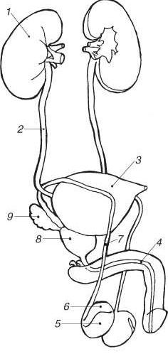 1 – почка; 2 – мочеточник; 3 – мочевой пузырь; 4 – мочеиспускательный канал и губчатое тело полового члена, начинающееся луковицей и заканчивающееся головкой полового члена; 5 – яичко; 6 – придаток яичка; 7 – семявыводящий проток; 8 – предстательная железа; 9 – семенные пузырьки