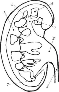 1 – корковый слой почки;2 – почечная лоханка; 3 – мочеточник; 4 – почечная пирамида, оканчивающаяся сосочком; 5 – большая почечная чашка; 6 – малая почечная чашка; 7 – мозговой слой почки
