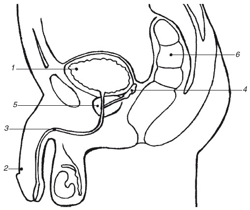1 – мочевой пузырь; 2 – половой член; 3 – мочеиспускательный канал (уретра); 4 – семенные пузырьки; 5 – предстательная железа; 6 – задний проход