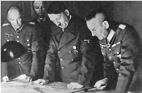 В ставке Гитлера. Слева направо: В. Браухич, А. Гитлер, Ф. Гальдер. 1941 г.