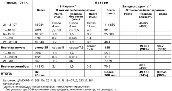 50 тыс. человек, 40 танков, 20 орудий, 15 минометов и около 50 станковых пулеметов, а за весь август 1941 г. более 138 тыс. бойцов и командиров, из них безвозвратно – 48,7 тыс. (35 % от общих потерь). За сентябрь потери составили более 70,6 тыс. человек, из них безвозвратно – 39,6 тыс. (43 % от общих потерь). Всего, за август – сентябрь 1941 г. войска фронта потеряли более 208 тыс. бойцов и командиров, из них безвозвратно – почти 80 тыс. (38 % от общих потерь). Поражает большое количество пропавших без вести – 49 163 человека (24 % от общих потерь), в том числе в сентябре – 19 835 чел. (28 % от общих потерь).
