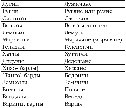 Вот таблица соответствий, выведенная В.П. Кобычевым в 1970-х годах нашего столетия. Слева – племена римской эпохи, справа – их славянские «наследники».